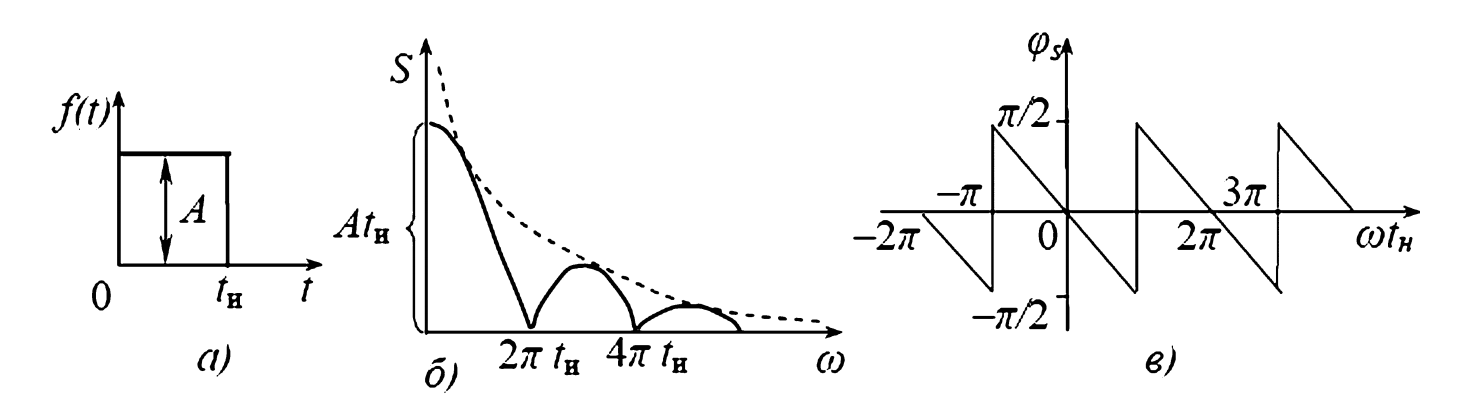 Фазо-частотный спектр (ФЧС) \(\phi_S(\omega)\) определяется аргументом этого выражения. Он имеет линейную зависимость \((-\omega t_и / 2)\) с разрывами (скачками) на \(\pi\) в точках, где \(\sin(\omega t_и / 2)\) меняет знак (т.е. \(\omega t_и = 2\pi k\)) (рис. 1в).