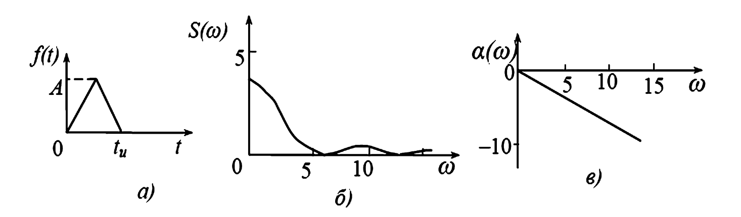 Для треугольного импульса (рис. 2а) с амплитудой \((A)\) и длительностью \((t_и)\) (основание треугольника), расчет спектра (путем интегрирования кусочно-заданной функции) дает следующий результат: