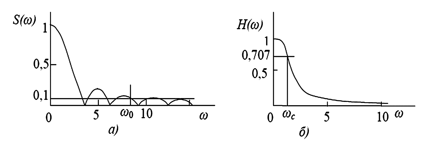 - Построить АЧС входного сигнала \((S(\omega))\). Для прямоугольного сигнала он имеет вид, показанный на рис. 3а.