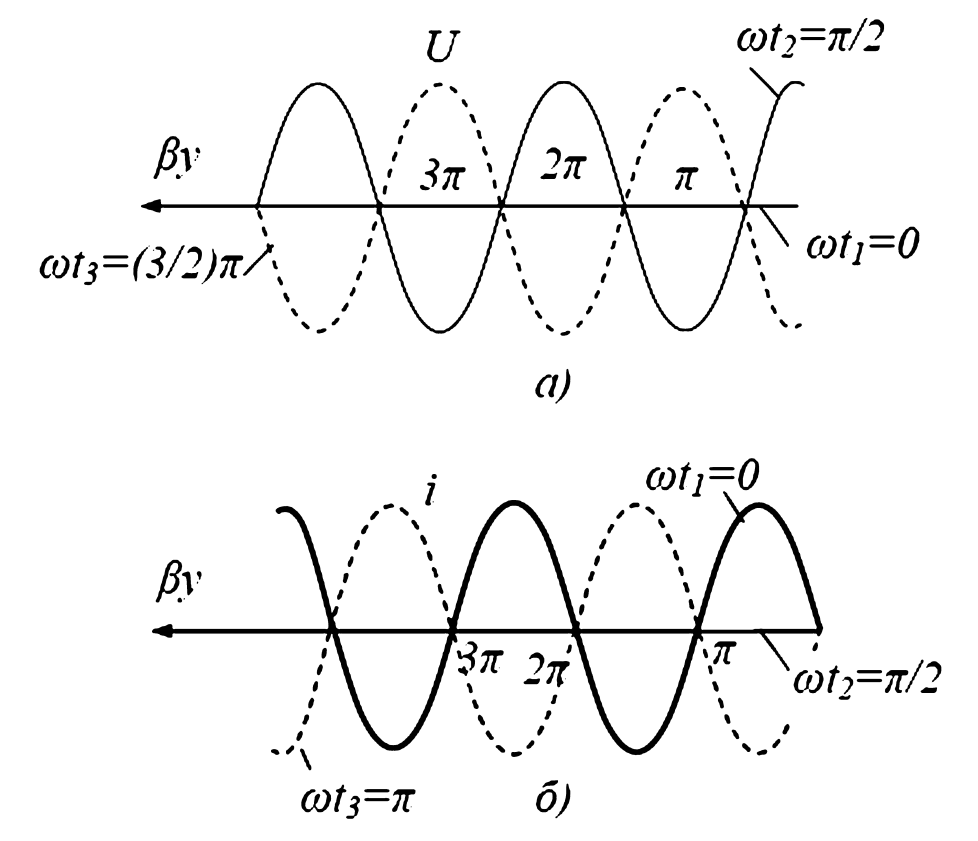 Как видно из рис. 3, узлы тока совпадают с пучностями напряжения, и наоборот. В режиме КЗ картина будет обратной: в конце линии (y=0) будет узел напряжения и пучность тока.