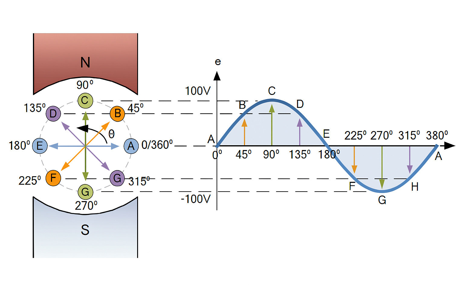 - Точка G (\(270^\circ\)): Проводник снова пересекает линии перпендикулярно, но уже двигаясь в обратном направлении относительно поля (снизу вверх). Возникает пиковое отрицательное напряжение (\(-E_{max}\)).