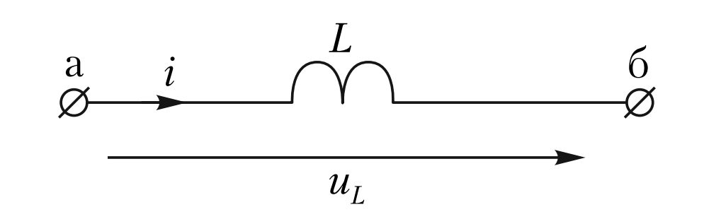 При выбранных на Рис. 1 положительных направлениях (когда стрелки тока и напряжения совпадают по направлению, что соответствует пассивной системе знаков), мгновенное значение напряжения на зажимах индуктивности \(u_L\) определяется разностью потенциалов между точками входа и выхода (\(\phi_а – \phi_б\)) и фундаментальным дифференциальным соотношением: