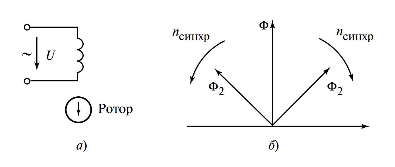 Переменный ток, протекая по обмотке, создает магнитное поле, вектор индукции которого не вращается в пространстве, а лишь пульсирует во времени (меняет амплитуду от \( +\Phi_{max} \) до \( -\Phi_{max} \)).