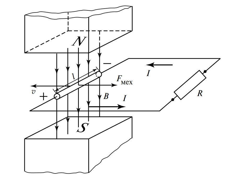 Согласно закону электромагнитной индукции, движение проводника в магнитном поле приводит к перераспределению зарядов внутри него. Свободные электроны под действием силы Лоренца смещаются к одному из концов проводника, создавая разность потенциалов. Так возникает электродвижущая сила индукции (ЭДС) \( e \).