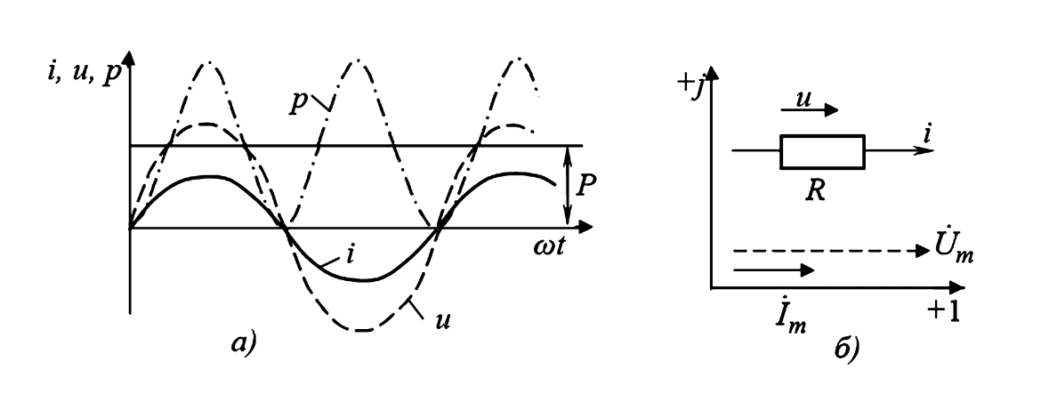 (б) — Векторная диаграмма на комплексной плоскости: векторы тока и напряжения совпадают по направлению.