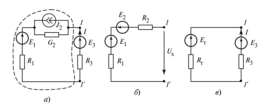 Мы получаем простейшую неразветвленную цепь, показанную на Рис. 2, в, состоящую из нашего эквивалентного генератора и нагрузки (\(R_3\), \(E_3\)).