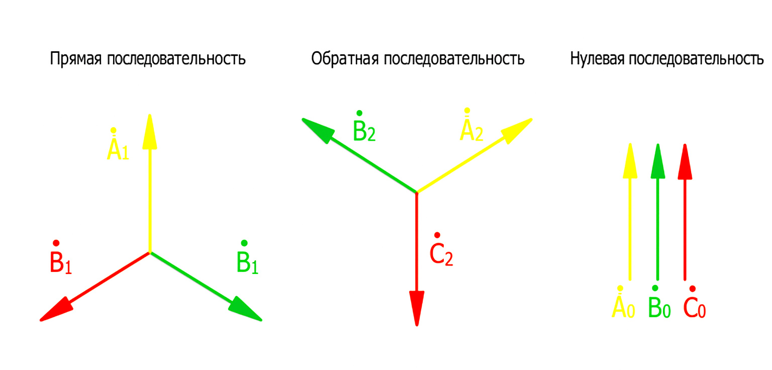- Система прямой последовательности (индекс «1»): Состоит из трех векторов одинаковой величины, сдвинутых друг относительно друга на 120°. Их порядок чередования (A-B-C) совпадает с порядком чередования фаз исходной системы.