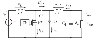 В базовой топологии, рассматриваемой в данной работе, силовой транзистор включается последовательно между источником первичного питания \( E \) и сглаживающим фильтром с нагрузкой. Рассмотрим схемотехнику подробнее.