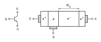 - В \(p\)-слой поступает коллекторный ток \(p-n-p\)-транзистора (схема с общим эмиттером).