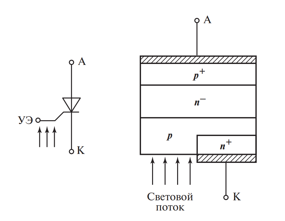 Фототиристор представляет собой однонаправленный четырехслойный \( p-n-p-n \) переключатель тока. Ключевой особенностью данного класса приборов является механизм перевода во включенное (проводящее) состояние: генерация электронно-дырочных пар происходит в результате фотоэлектрического эффекта при поглощении квантов света в полупроводниковой структуре.