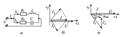 В электрической цепи, содержащей разнородные реактивные элементы (индуктивности \(L\) и ёмкости \(C\)), возможны особые режимы работы, когда вектор общего напряжения и вектор общего тока на входе цепи совпадают по фазе. В таком режиме входное сопротивление (или проводимость) цепи становится чисто активным, а суммарная реактивная мощность, потребляемая от источника, равна нулю. Вся энергия, поступающая от источника, расходуется только на активных сопротивлениях.