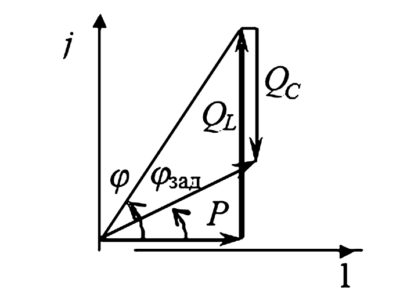 $$ Q_L = P \cdot \ tan \varphi_1 = 200 \cdot \ tan (58,2^\circ) \approx 322 \text{ квар} $$ - Требуемая реактивная мощность после компенсации: