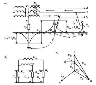 - Через заземлитель подстанции возвращается в нейтраль трансформатора.