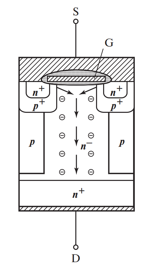 (Схематичное отображение: G — затвор, S — исток, D — сток, чередующиеся столбцы p и n)