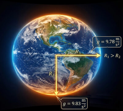 - Географической широты: На полюсах \( g \) больше (\(\approx 9.83 \, \text{м/с}^2\)), на экваторе меньше (\(\approx 9.78 \, \text{м/с}^2\)) из-за центробежной силы вращения Земли и сплюснутости планеты.