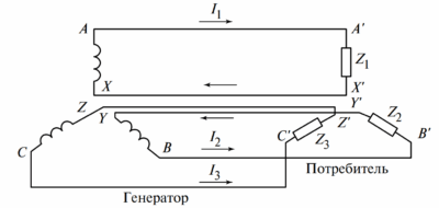 Рис. 3. Трехфазная цепь с несколькими разнородными приемниками