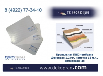 Примечание: Декопран, ПВХ-мембраны Декопран, ПВХ-мембрана для кровли - Декопран, Декопран ПВХ-мембрана - 1.2 мм, намотка 15 м.п., армированная