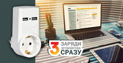 Адаптер с USB-разъемами 2,1 А IEK® позволяет зарядить 3 устройства одновременно.