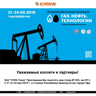 Приглашаем посетить стенд № 205, зал №3 ЗАО "СПКБ Техно" на выставке «Газ.Нефть.Технологии», которая пройдёт с 21 по 24 мая 2019 года в ВДНХ Экспо в городе Уфа.