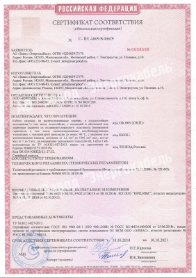 На основании проведенных испытаний получен сертификат соответствия Техническому регламенту о требованиях пожарной безопасности (Федеральный закон от 22.07.2008 г. № 123-ФЗ) для кабелей марки FROSTLINE.