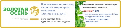 С 5 по 8 октября 2016 г. «АтомСвет Энергосервис» примет участие в 18-ой Российской аграрной выставке «Золотая осень», проходящей при поддержке Министерства сельского хозяйства РФ.