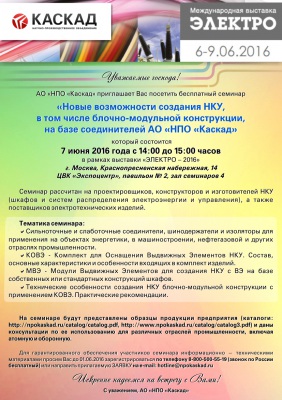 7 июня в рамках выставки "Электро-2016" НПО "Каскад" приглашает посетить семинар "Новые возможности НКУ, в том числе блочно-модульной конструкции, на базе соединителей АО "НПО "Каскад". Семинар рассчитан ...[ далее ]